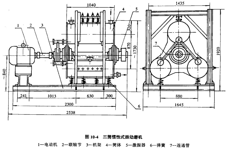三筒慣性式振動(dòng)磨機(jī)的構(gòu)造如圖10-4所示。它由電機(jī)1、聯(lián)軸節(jié)2、機(jī)架3、筒體4、激振器5、彈簧6相連通管7等部分組成。振動(dòng)磨機(jī)的筒體由三個(gè)圓筒和兩塊側(cè)板構(gòu)成,通過兩側(cè)板將較大的上圓筒φ400 xl040和較小的兩個(gè)下圓筒φ320 xl040串聯(lián)在一起,而兩個(gè)下圓筒彼此互成并聯(lián),各圓筒內(nèi)壁上均鈕有襯板,以防筒壁磨損。激振器主要由偏心軸、可調(diào)式偏心塊、鑄鋼軸承座、雙列調(diào)心滾子軸承和迷宮式密封環(huán)等組成。電機(jī)1通過彈性聯(lián)軸節(jié)2帶動(dòng)激振器5的偏心軸及安裝在軸兩側(cè)的偏心塊旋轉(zhuǎn),產(chǎn)生離心力,從而使坐落在彈簧上的筒體產(chǎn)生高頻小幅振動(dòng)。物料和水不斷地從上圓筒的給料口加入,物料在筒內(nèi)粉磨介質(zhì)的頻繁沖擊和研磨作用下被磨細(xì),完成第一段粉磨,而后經(jīng)過排料連通管分別流入下部?jī)蓚(gè)小圓筒內(nèi)進(jìn)行第二段粉磨,粉磨好的合格產(chǎn)品從小圓筒的排料口排出。整個(gè)粉磨作業(yè)為連續(xù)作業(yè)。
