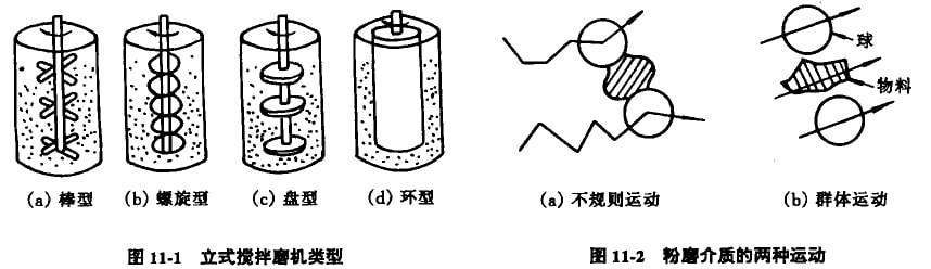 立式攪拌磨機的種類較多,按攪拌器結(jié)構(gòu)形式可分為:棒式攪拌磨、螺旋式攪拌磨、盤式攪拌磨和環(huán)式攪拌磨,如圖11-1所示;按工作方式可分為:間歇式攪拌磨和連續(xù)式攪拌磨;按粉磨作業(yè)特點可分為:濕式攪拌磨和干式攪拌磨。