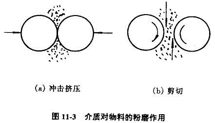 在立式攪拌磨機中,粉磨介質(zhì)的這種非群體的不規(guī)則運動,其結(jié)果造成介質(zhì)之間撞擊及介質(zhì)以不同轉(zhuǎn)速和方向旋轉(zhuǎn)著,從而對鄰近的物料施加沖擊力、擠壓力和剪切力,如圖11-3所示。物料在這些力的聯(lián)合作用下被細磨或超細粉磨。