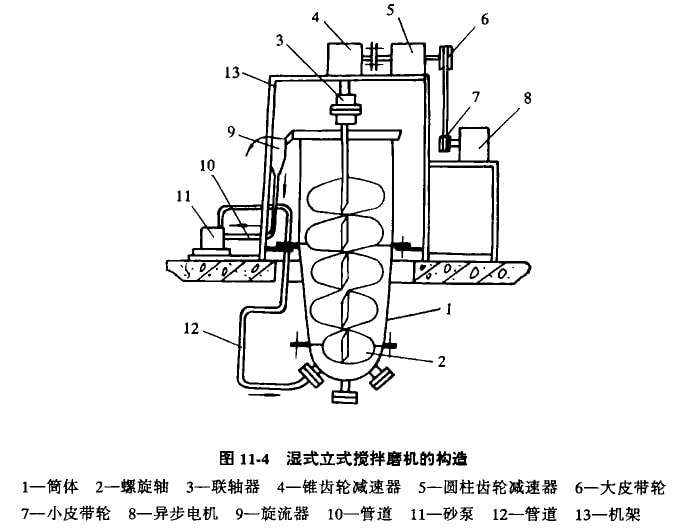 濕式立式攪拌磨機的構(gòu)造如圖11-4所示。它由垂直不動的筒體1、懸垂在筒體中心的螺旋軸2、聯(lián)軸器3、錐齒輪減速器4、圓柱齒輪減速器5、大皮帶輪6、小皮帶輪7、異步電機8、旋流器9和砂泵11等組成。在筒體I內(nèi)充填粉磨介質(zhì),筒體內(nèi)的螺旋軸2由電機遇過皮帶輪、減速器和聯(lián)鈾器的帶動而旋轉(zhuǎn)。由于螺旋抽的旋轉(zhuǎn),使粉磨介質(zhì)沿螺旋面上升并作不規(guī)則地翻滾運動,因筒體內(nèi)壁與螺旋軸之間有間隙,粉磨介質(zhì)上升到一定高度后離開螺旋面,在重力作用下粉磨介質(zhì)沿筒體內(nèi)壁下降,然后再沿螺旋面上升,在如此上下循環(huán)的往返過程中,將加入筒內(nèi)的物料,由粉磨介質(zhì)相互之間的沖擊、擠壓和剪切作用而磨細。磨細的物料從筒體上部出口溢流進入水力分級裝置旋流器2進行分級,校流器的溢流即為粉磨產(chǎn)品,而粗粒產(chǎn)品沉向旋流器下部,通過管道10進入砂泵lI,再返回筒體內(nèi)進行循環(huán)粉磨。