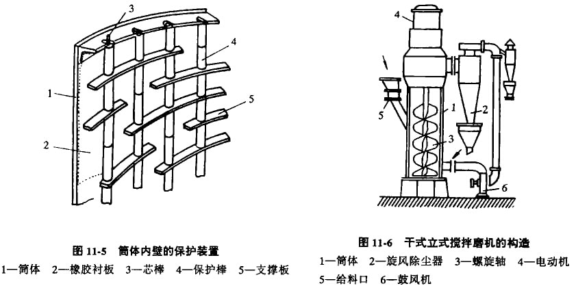 干式立式攪拌磨機由筒體1、收集產(chǎn)品的旋風除塵器2、螺旋軸3、電動機4、給料口5和鼓風機6等組成。筒體1內(nèi)充填粉磨介質(zhì),筒體1內(nèi)的螺旋鈾3由其上部的電動機4帶動而旋轉(zhuǎn),使筒內(nèi)粉磨介質(zhì)產(chǎn)生上下的循環(huán)運動。此時,由給料口5給入物料進行粉磨,被粉磨好的產(chǎn)品由鼓風機6吹向筒體1的上部排出,由旋風除塵器加以回收?諝鈩t再由鼓風機吸入并送入衙內(nèi),構(gòu)成筒體和旋風除塵器之間的循環(huán)。加壓的空氣由旋風除塵器和鼓風機中的送風管放出。