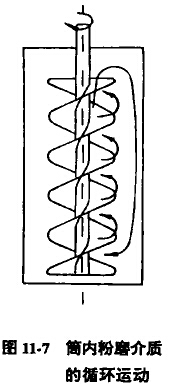 由于螺旋軸的旋轉(zhuǎn),螺旋葉片區(qū)內(nèi)的介質(zhì)沿葉片斜面向上運動,直至葉片頂部,又由于螺旋葉片產(chǎn)生的離心力將運動到頂部的粉磨介質(zhì)推向筒壁與螺旋葉片外綠形成的環(huán)形區(qū),粉磨介質(zhì)在環(huán)形區(qū)內(nèi)向下運動,運動到筒底后再進入螺旋,沿螺旋葉片斜面向上運動,這樣便形成了自內(nèi)向上、自外向下的垂直循環(huán)運動。