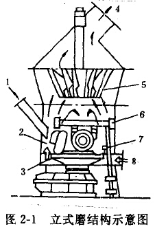 (1)主要結(jié)構(gòu)及功能 圖2-1為立式磨的結(jié)構(gòu)示意圖。立式磨主要由電動機、減速機、磨輥、磨盤、選粉機構(gòu)、殼體、加壓裝置、潤滑裝置等部分組成。
