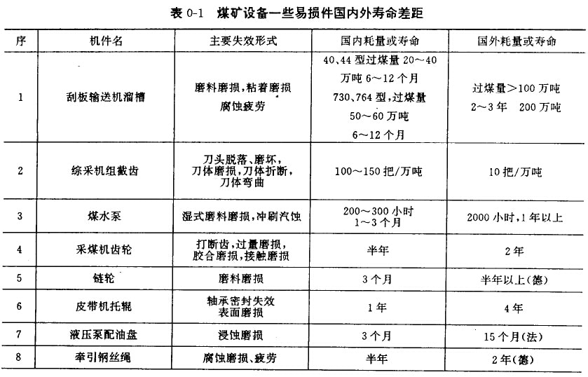 另一方面,我國(guó)礦山機(jī)械設(shè)計(jì)相制造過(guò)程中由于受傳統(tǒng)習(xí)慣的束縛,及對(duì)摩擦學(xué)知識(shí)缺乏了解,不能將當(dāng)今國(guó)內(nèi)外先進(jìn)的抗磨技術(shù)相耐磨材料及時(shí)地應(yīng)用在礦山機(jī)械設(shè)計(jì)制造上,造成我國(guó)礦山機(jī)械易磨損機(jī)件的使用壽命遠(yuǎn)遠(yuǎn)低于國(guó)外先進(jìn)水平。具體情況見(jiàn)表0-1。