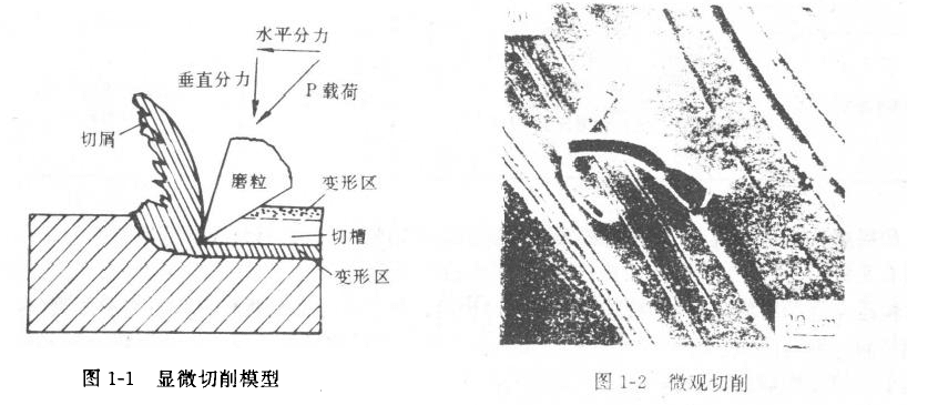 磨粒作用在金屬材料表面上,磨料上承受的就荷P可分為法向分力都切向分力。在法向分力作用下,磨料的棱角刺入材料表面,在切問分力作用下,磨粒沿平行于表面方向滑動,帶有銳利棱角并具有合適的迎角的磨粒能切削材料而形成切屑(見圖1-1)。圖1-2是一典型的磨粒切削材料而形成顯微切屑過程的照片。可以看出,切屑仍然立在淡面上,黑色的磨粒仍然鑲嵌在切屑的根部。磨粒切削過程使材料表面產(chǎn)生某種校度的理性變形,圖1-2上還可以看到劃痕兩邊戲留的剪切皺折。這種切削過程與機(jī)加工過程產(chǎn)生的切屑極為相似,只是體積小些、故稱為微觀切削。