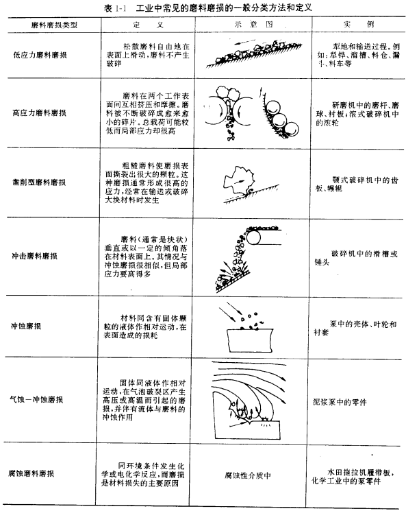 由粗糙硬表面把較軋的工作表面劃傷,或者工作表面受外界硬粒劃傷,都用于磨料磨損。在礦山機(jī)械、工程機(jī)械、農(nóng)業(yè)機(jī)械等行業(yè)戶與泥沙、礦石或灰渣等立按摩擦。都會發(fā)生不同形式的磨料磨損。據(jù)統(tǒng)計,因磨料磨損而造成的損失占整個工業(yè)范圍磨損損失的50%。對磨料磨損的分類很多文獻(xiàn)都習(xí)慣引用Avery和Rigney的分類法(見表1-1)。