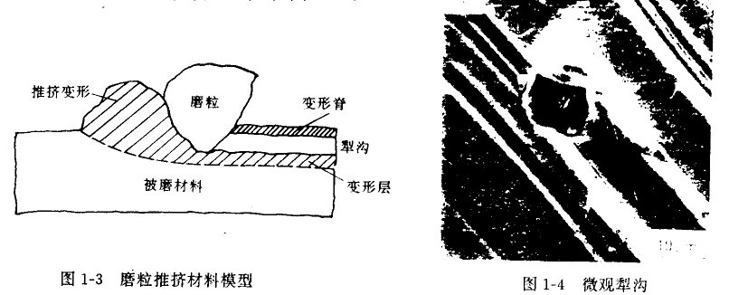 如果磨粒不夠尖銳,或刺入材料表面角度不適合切削,則會將材料表面擠出犁溝。犁溝變形有兩種:一種是由于磨粒推擠材料,使之堆積在廟版運(yùn)動的前方,當(dāng)堆積增高后就會阻礙磨粒運(yùn)動直到磨粒破碎,或被其他磨粒破碎帶走。第二種是磨粒將材料擠向溝槽兩側(cè)(也可能擠向一側(cè)),圖l-3所示為帶有負(fù)前角的磨版推擠材料的模型。圖1-4是磨粒推擠材料形成犁溝的過程照片。磨粒犁溝材料表面并不能一次產(chǎn)生磨屑,而是當(dāng)?shù)谝粋磨粒推擠材料表面形成犁詢后,已經(jīng)使溝榴底部或溝槽兩側(cè)金屆發(fā)生—“定程度的塑性變形,后繼的磨?赡芮邢鹘饘倩蚶^續(xù)推擠已經(jīng)發(fā)生理性交形的犁溝構(gòu)底或兩側(cè),當(dāng)磨粒多次使金屬變形且變形程度超過材料允許的延伸極限后,變形材料表面就會產(chǎn)生裂紋,裂紋擴(kuò)展,形成薄片狀磨屑,這一磨損過程被稱為微觀犁溝(圖1-4)。