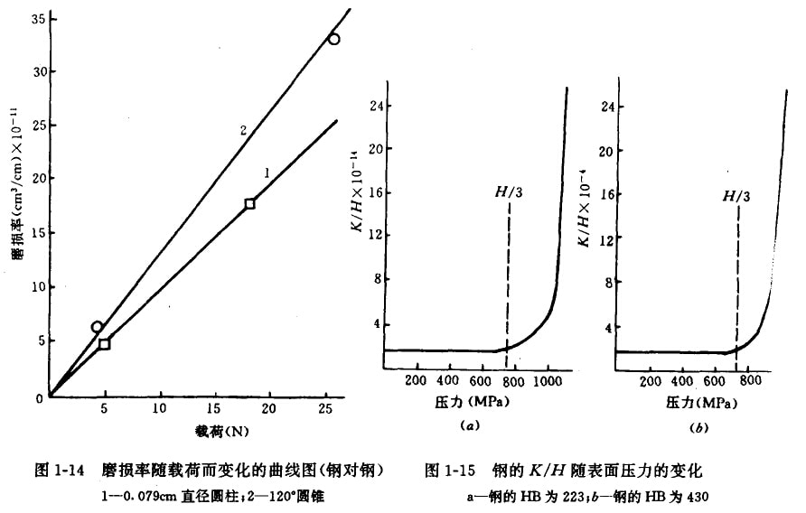 粘著磨損率在一定范圍內(nèi)與載荷成正比。圖1-14表示鋼與鋼聯(lián)擦?xí)r磨損串與載荷之間的關(guān)系。超過此范圍加載就得到圖1-15a、b的結(jié)果。圖中表示不同硬度鋼的粘著磨損系數(shù)與硬度比值所丹和壓應(yīng)力間的關(guān)系。當(dāng)表面壓應(yīng)力小于H/3(H為鋼的硬度)時(shí),K值不變,即磨損量與裁荷成正比,當(dāng)超過此臨界值后,K值急劇上升.磨損量也急劇增大。實(shí)際上,在高載荷下會(huì)發(fā)生大面積焊合與咬死。