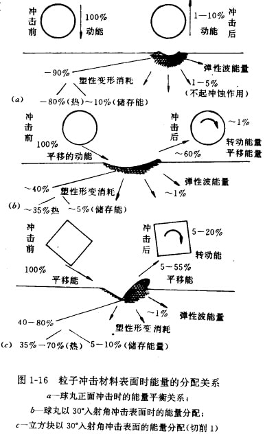 圖1-16是能量分配的示意圖。垂直入射的球九沖擊后僅剩下入射能量的1%-10%,其余大部分能量均失散在表面上,其中包括對沖蝕不起作用的彈性波損耗(1-5%)及塑性壓痕所消耗的大量能量(1-90%)。消耗在材料上的總能量有80%變成效而失散,約10%以形成品體位帶或其他晶體缺陷而儲存在材料內(nèi)。斜射的立方塊和球丸在能量分配上顯示出另外的比例關(guān)系。