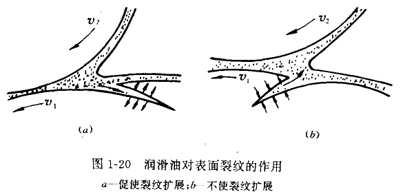 (1)裂紋起源于表面在滑動(dòng)摩擦或滾動(dòng)帶有滑動(dòng)摩擦?xí)r,待別是當(dāng)表面存有缺陷時(shí),裂紋就容易從表面開始。例如兩齒輪在接觸過程中,表面不僅有交變接觸壓應(yīng)力而且還有剪叨應(yīng)力。根抓赫茲的理論,最大壓應(yīng)力發(fā)生在表面上,而最大的剪應(yīng)力發(fā)生在離表面一定距離處。圖1-19為剪應(yīng)力發(fā)生在表面下距離變化曲線。在表面壓應(yīng)力和剪應(yīng)力反復(fù)作用一定周次之后,材料慶面就會(huì)產(chǎn)生局部的塑性變形相加工硬化,在漿些組織不均勻處,密易形成裂紋源,導(dǎo)致裂紋出現(xiàn)與擴(kuò)散。當(dāng)接觸表面存有潤(rùn)滑油且滾動(dòng)力。向與裂紋端部方向一致時(shí).波動(dòng)物體首先封住裂紋裂口處。(如圖1-20所示),裂紋中的潤(rùn)滑油被培在裂縫小,在接觸歷應(yīng)力作用下嚴(yán)生高壓油波,迫使裂紋向30°-45°角方向擴(kuò)展。當(dāng)裂紋向內(nèi)表面擴(kuò)展到一定深度都覽度時(shí),裂紋上部如同一懸臂梁承受交變彎肋應(yīng)力,最后因強(qiáng)度不足而折斷成金用磨屑,并留下麻點(diǎn)狀利落坑。