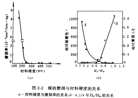 (1)煤與其他磨料一樣具有共同的磨料磨損性。Ha/Hm=0.64為轉(zhuǎn)折點(diǎn),(式中Ha為磨料硬度.Hm為金屬材料硬度),當(dāng)Ha/Hm>0.64,磨料硬度不變時(shí),隨材料的硬度降低,磨損急劇上升;當(dāng)Ha/Hm<0.64,磨料硬度不變時(shí),隨材料硬度提高,磨損率趨近于零。