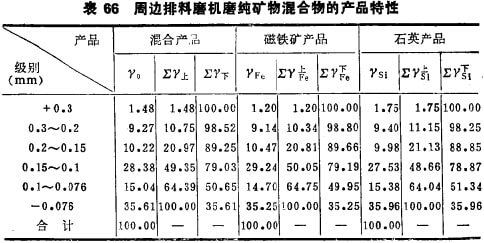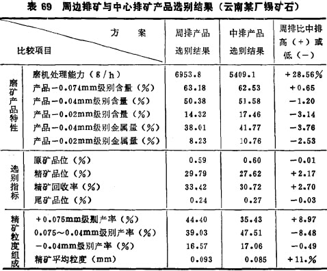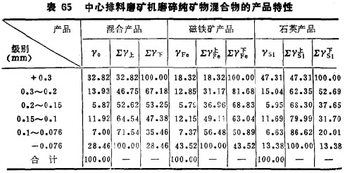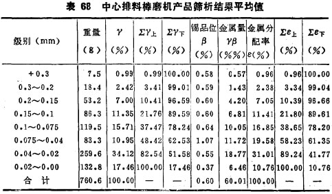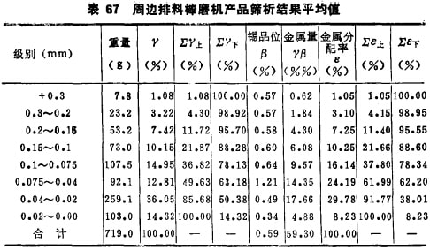 例如,用1~0.5mm的純石英及純磁鐵礦混合物(兩種礦物各占50%)在中心排料球磨機(jī)及周邊排料棒磨機(jī)中進(jìn)行磨碎試驗(yàn),結(jié)果列入表65及66。從表65及66的結(jié)果可以計(jì)算出,中心排礦時(shí)石英產(chǎn)品的平均粒度為0.56mm,磁鐵礦產(chǎn)品的平均粒度0.292mm, 二者的粒度差為1.93倍,兩種礦物一200目的產(chǎn)率差高達(dá)30.14%;而周邊排礦時(shí)石英產(chǎn)品的粒度為0.15mm,磁鐵礦產(chǎn)品的粒度0.146mm, 二者粒度僅差1.04倍,兩種礦物極為接近,而且兩種礦物一200目的產(chǎn)率也僅差0.71%。在中心排料磨礦機(jī)內(nèi),礦料的選擇磨碎作用是加速大密度軟礦物的磨碎速度,并拉大軟硬礦物的粒度差;而在周邊排料磨礦機(jī)內(nèi),礦料的選擇磨碎作用則是減緩大密度軟礦物的磨碎速度,并縮小軟硬礦物的粒度差。這就是說,中心排礦方式對回收礦物密度大、且礦物 硬度低的礦石不適宜,而周邊排礦磨礦機(jī)正好相反,它對回收脆 性和大密度礦物有利,具有保護(hù)脆性和大密度礦物少遭過磨及過粉碎的強(qiáng)烈作用。例如,鎢礦石、錫礦石及銻礦石的磨礦,采用為了證明周邊排礦磨礦機(jī)在生產(chǎn)上應(yīng)用的可能性,采用實(shí)際礦石進(jìn)行開路磨碎試驗(yàn)。試料選用云南某廠錫石硫化礦石,其中大密度且脆性大的礦物為錫石,硬度大的脈石礦物主要為輝石 (密度比錫石小得多),礦石破碎至3~0mm后在周邊排料棒磨機(jī)及中心排料棒磨機(jī)中進(jìn)行磨碎對比試驗(yàn),其他磨機(jī)工作條件保持完全相同以便查明排礦方式對實(shí)際礦石磨碎的影響,試驗(yàn)結(jié)果列入表67及68。兩種磨機(jī)的磨礦產(chǎn)品分別按同樣選別條件進(jìn)行選別,選別結(jié)果列入表69。此外,對云南某廠堆積多年的錫礦老尾礦進(jìn)行了球磨對比試驗(yàn),結(jié)果列入表70;對廣西某廠的錫礦石也同樣進(jìn)行了棒磨對比試驗(yàn),產(chǎn)品也同樣進(jìn)行選別,磨礦產(chǎn)品特性 及選別結(jié)果列入表71,對廣西某廠的錫礦石還進(jìn)行過閉路方案的對比試驗(yàn)。