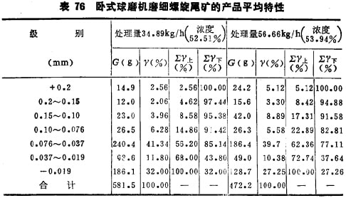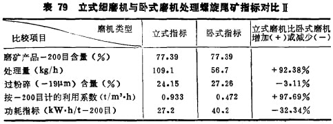 為了說明立式磨的工作特性,在容積相同的臥式及立式磨機中用某公司的老尾礦進行了磨碎對比試驗,老尾礦試料用螺旋溜槽選分為精礦及尾礦兩部分,精礦含鐵礦物較多,比較難磨,密度較大,尾礦的密度較小,比較好磨一些。用可磨性不同的兩份試料驗證立式磨的工作性能,試驗用的立式磨及臥式磨的結(jié)構(gòu)及工作參數(shù)見表72示。表73及74中分別列出臥式磨及立式磨磨碎螺旋精礦的產(chǎn)品特性,表75列出臥式與立式磨磨碎螺旋精礦的磨礦指標對比。表76及77分別列出臥式及立式磨磨碎螺旋尾礦的產(chǎn)品特性,表78及79分別列出臥式及立式磨在不同磨礦細度下磨碎螺 旋尾礦的指標對比。