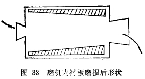 磨機(jī)給礦端的礦塊大,鋼球磨損厲害,襯板自然也磨損嚴(yán)重,長(zhǎng)期磨損的結(jié)果將形成襯板的軸向坡度,使給礦端的襯板薄,排礦瑞的襯板厚,如圖33所示。這種坡度的存在又阻礙了給礦端小球向排礦端的移動(dòng)。此外,在球磨機(jī)內(nèi)鋼球 還發(fā)生徑向離析:即大球偏向內(nèi)層,小球集中到外層。而處于內(nèi)層的大球由于礦漿流向排曠端所發(fā)生的沖力也難于向給礦端移動(dòng)。磨機(jī)內(nèi)鋼球的不合理分布,若采用"分級(jí)襯板"則可改變這種狀況,分級(jí)襯板沿磨機(jī)軸向呈螺旋分布, 所以隨著筒體的轉(zhuǎn)動(dòng)能將處于外層的小鋼球推向排礦端,而處于中心部分的大球也就滾向給礦端,結(jié)果使給礦端分布大球,排礦端分布小球。球的分布趨于合理,破碎力趨于精確,磨碎作用的選擇性自然也隨之提髙,這不僅能降低物 料的過粉碎,提高解離的選擇性,而且可使磨機(jī)的生產(chǎn)能力提髙10~15%。目前興起的角螺旋襯板,除能對(duì)介質(zhì)起一定分級(jí)作用外,還能使物料與介質(zhì)充分拌合,有利于磨碎作用,因此盡管安裝角螺旋襯板后磨機(jī)容積有所降低,但磨機(jī) 的生產(chǎn)率仍提髙10~15%,電耗也有所下降?梢,分級(jí)襯板的形式是可取的。