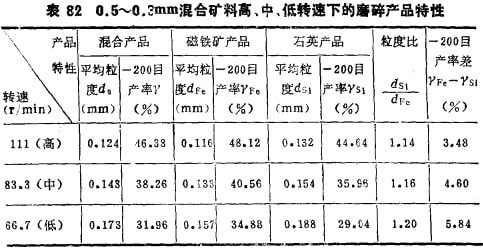 當(dāng)磨機(jī)結(jié)構(gòu)參數(shù)一定時(shí),磨機(jī)內(nèi)鋼球的運(yùn)動(dòng)狀態(tài)將完全取決于磨機(jī)的轉(zhuǎn)速及介質(zhì)的充填率;而當(dāng)介質(zhì)充填率一定時(shí),在一定范圍內(nèi)隨著轉(zhuǎn)速的增加鋼球上升高度增大,鋼球的打擊力增強(qiáng),同時(shí),鋼球的相對(duì)運(yùn)動(dòng)速度也增大。破碎力大,破碎效率提高,但破碎的選擇性降低。為了說明轉(zhuǎn)速的影響,現(xiàn)選用2~lmm、1~0.5mm和0.5~0.3mm三組不同粒級(jí)的磁鐵礦與石英混合物(各占50%)作髙、中、低三種轉(zhuǎn)速的磨碎考查,結(jié)果列于表80~82。三種轉(zhuǎn)速是:一種為超臨界轉(zhuǎn)速(lllr/min,試驗(yàn)?zāi)C(jī)臨界轉(zhuǎn)速為l00r/min);中等轉(zhuǎn)速為"最適宜的轉(zhuǎn)速"(83.3r/min);低轉(zhuǎn)速為轉(zhuǎn)速率76%以下(66.7r/min)。