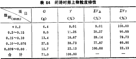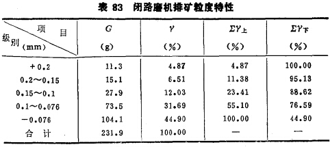 為了說明閉路磨礦的優(yōu)越性及選擇性保護有用礦物少遭過粉碎,現(xiàn)舉一組閉路磨礦的試驗結果如下:試驗為磨機與濕式細篩 閉路,篩孔為200目,表83、84及85分別為閉路時磨機排礦、篩上物及篩下物粒度特性。表86則為閉路細磨與開路細磨技術指標的比較。