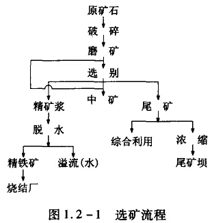 礦石從采場采出以后,要經(jīng)過一系列的作業(yè)程序才能得到適合冶煉要求的精礦產(chǎn)品。這些作業(yè)程序一般為原礦處理(破碎、磨礦),選別(磁選、浮選、重選等)和精礦脫水(濃縮、過濾、干燥)等作業(yè)。其生產(chǎn)流程如圖1.2-1所示。