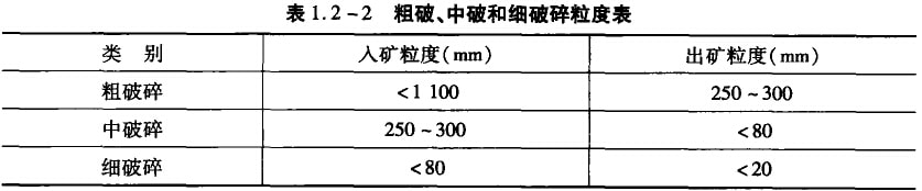 根據(jù)給礦粒度和最終破碎產(chǎn)品粒度要求,破碎分一段、兩段、三段破碎。三段破碎分別為粗破、中破和細破碎,參見表1.2-2。