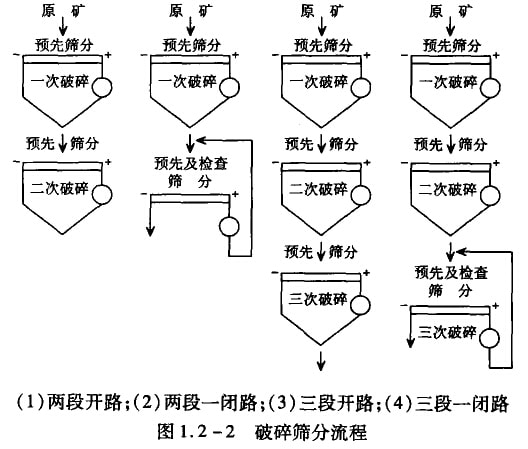 破碎篩分流程包括破碎作業(yè)和篩分作業(yè)。因礦石經(jīng)過破碎機次數(shù)的不同分為兩段和三段破碎;又按有無檢查篩分作業(yè)而分為閉路和開路兩種。如圖1.2-2。