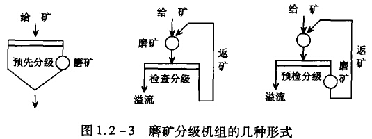 分級就是將細粒礦石按粒度和比重分為不同的級別,以達到保證人選粒度的目的。對于濕磨,礦石的分級是在水中進行的。分級設(shè)備通常與磨礦機聯(lián)在一起構(gòu)成磨礦分級機組(見圖1.2-3)。分級設(shè)備通常在磨礦分級機中可以起到三種作用:一是起預(yù)先分級的作用,二是起檢查(或控制)分級的作用,三是起預(yù)先和檢查分級兩種作用。