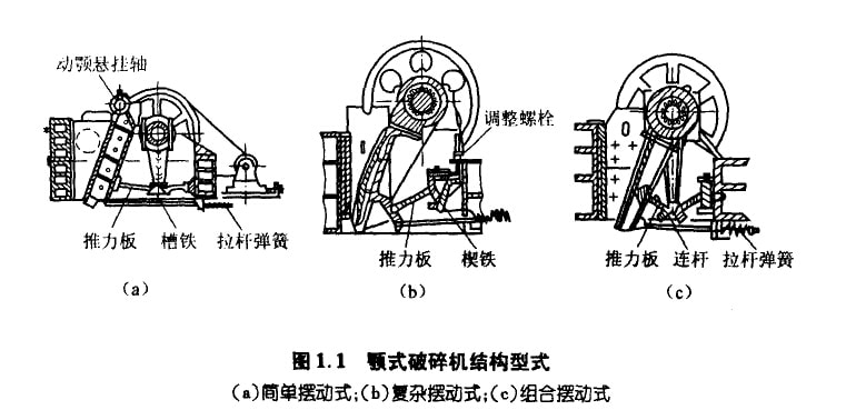顎式破碎機(jī)按活動(dòng)顎板的運(yùn)動(dòng)狀態(tài)可分為簡單擺動(dòng)、復(fù)雜擺動(dòng)和組合擺動(dòng)三種類型,如圖1.1所示。圖中(b)和(c)型顎式破碎機(jī) 的共同特點(diǎn)是:物料塊在破碎顎板之間除受擠壓作用外,同時(shí)還受研磨力的作用,因此破碎效率較高。顎式破碎機(jī)排料口的大小,可通 過調(diào)整座楔塊的升降進(jìn)行調(diào)節(jié)。設(shè)備的安全裝置由支承動(dòng)顎的肘板兼顧,當(dāng)破碎腔內(nèi)進(jìn)入堅(jiān)硬異物時(shí),設(shè)備超員荷運(yùn)行致使肘板首先斷 裂,從而使設(shè)備受到保護(hù)。