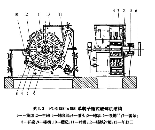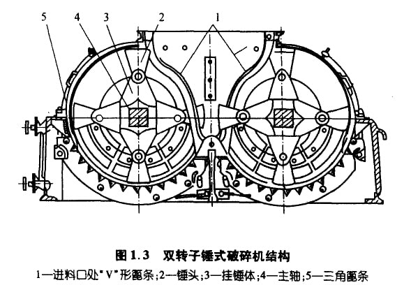 錘式破碎機(jī)按回轉(zhuǎn)軸的軸數(shù)分類,有單轉(zhuǎn)子和雙轉(zhuǎn)子兩種型式;按轉(zhuǎn)子回轉(zhuǎn)方向分類,有可逆式和不可逆式之區(qū)別。錘式破碎機(jī)的捶 頭結(jié)構(gòu)和村質(zhì)是決定產(chǎn)品質(zhì)量和破碎效率的重要部件.為了延長錘頭的使用壽命,一般在錘頭的兩端均開設(shè)安裝孔,以便調(diào)頭安裝或正 反面調(diào)換使用。圖1.2和圖1.3分別為單轉(zhuǎn)子和雙轉(zhuǎn)子錘式破碎機(jī)的結(jié)構(gòu)原理圖。雙轉(zhuǎn)子捶式破碎機(jī)設(shè)有‘v”形篦條,在一 對(duì)轉(zhuǎn)子的上錘頭之間構(gòu)成了一個(gè)預(yù)破碎腔,大塊物料在進(jìn)入兩回轉(zhuǎn)軸形成的兩個(gè)細(xì)碎腔之前,先進(jìn)行預(yù)破碎,因此,這種破碎機(jī)具有破 碎比大、喂料均勻、兼有預(yù)碎和細(xì)碎兩段破碎功能等特點(diǎn),常被用作石灰石一段破碎系統(tǒng)。