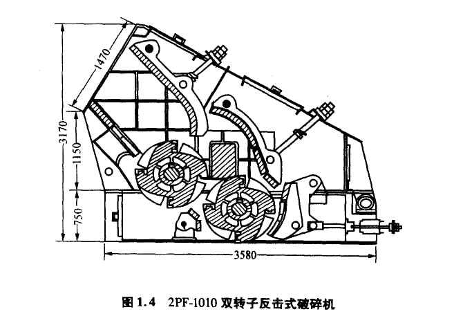2PF-1010雙轉(zhuǎn)子反擊式破碎機(jī)可用來破碎游離石英量<7%,水分<10%的石灰石、石膏和泥灰?guī)r等抗壓強(qiáng)度<140MPa的物料,如圖 1.4所示。