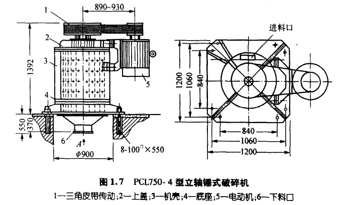 立軸捶式破碎機(jī)由上蓋、機(jī)殼、立軸轉(zhuǎn)子、底座和傳動(dòng)裝置等部分組成(參見圖1.7)。上蓋一側(cè)設(shè)有喂料口,機(jī)殼內(nèi)裝有反擊板,中 心立軸轉(zhuǎn)子對(duì)稱布置有板錘或鏈錘,傳動(dòng)采用異步電動(dòng)機(jī)和三角皮帶,底座下部設(shè)有出料溜子。物料均勻喂入近料口,自由墜落過程中 被高速錘頭錘擊,物料在錘頭與反擊板之間又相互沖擊,被粉碎物料由底部排出。