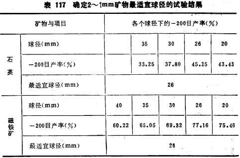 采用2~lmm的石英及2~lmm的磁鐵礦各占50%的混合礦料進行磨碎,在磨碎前先用試驗方法確定2~lmm石英及磁鐵礦所需的最適宜球徑(表117)。