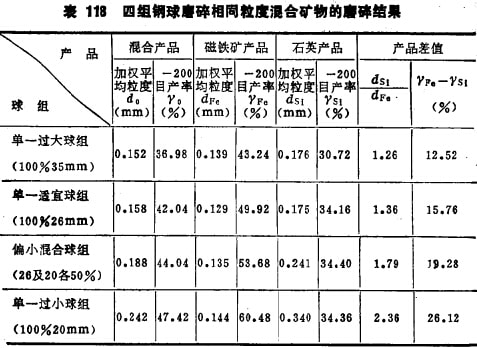 由于2~lmm的石英及磁鐵礦最適宜的球徑均為26mm,故采用100%的26mm的球組為單一最適宜球組;而100%35mm的球組為單一過大球組;100%20mm球組為單一過小球組,采用 26mm及20mm各占50%的混合球組為偏小配合的球組。四組鋼球的重量相同,磨礦條件相同,僅只球徑不同。對四組鋼球分別進行磨碎試驗,并將磨碎產(chǎn)品進行選別,求出混合產(chǎn)品及石英與磁鐵礦單一產(chǎn)品的粒度特性,試驗結果列于表118。