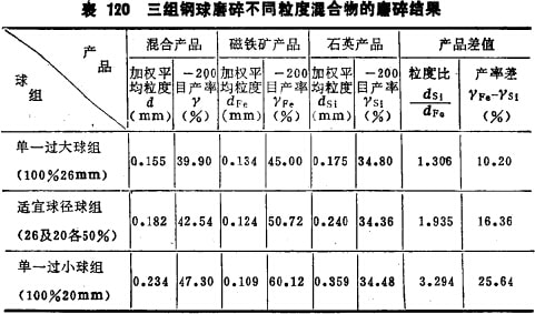 根據(jù)此不同粒度礦物混合物的粒度組成情況(即50%2~1mm石英及50%1~0.5mm磁鐵礦的混合物),最適宜球徑的配比應該是26mm及20mm鋼球各占50%; 26mm球為100%時則為過大球組;20mm球占100%時則為過小球組。三組球的球荷重量及磨礦條件均相同,三組球的磨碎結果列于表120。