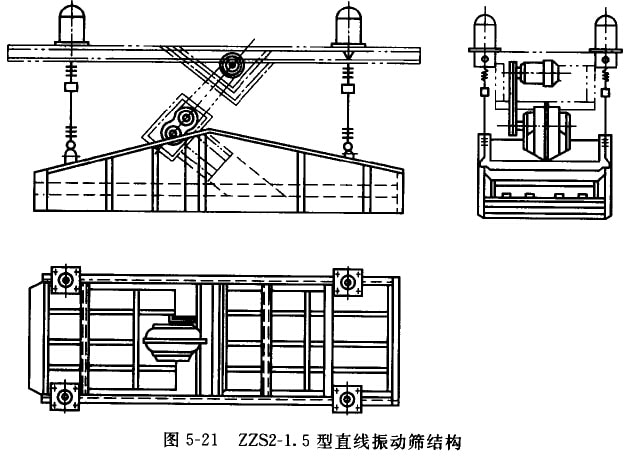 ZZS型直線(xiàn)振動(dòng)篩也是一種吊掛式振動(dòng)篩,有ZZDS2-1.5型和ZZS1-1.8型兩種,前者為雙層篩面,后者為單層篩面。這種篩分機(jī)結(jié)構(gòu)簡(jiǎn)單,工作可靠。