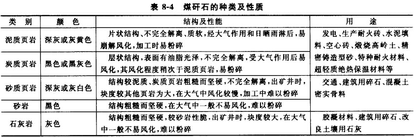 按巖石特性不同,煤殲石可以分為泥質(zhì)頁巖、炭質(zhì)頁巖、砂質(zhì)頁巖、砂巖及石灰?guī)r,性能及用途如表8-4所示。