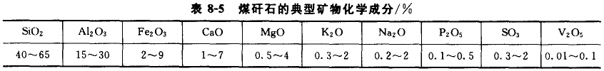 煤矸石是煤礦中夾在煤層間的脈石(又稱夾矸石)。大部分煤殲石結(jié)構(gòu)較為致密,呈黑色,自燃后呈淺紅色,結(jié)構(gòu)較疏松。煤殲石的主要礦物成分為高嶺石、蒙朋石、石英砂、硅酸鹽礦物、碳酸巖礦物、少量鐵鐵礦及碳質(zhì),且高嶺石含量達(dá)68.7%,構(gòu)成礦構(gòu)成分的元素多達(dá)數(shù)十種,一般以Si、Al為主要成分,月外含有數(shù)量不等的Fe、Ca、Mg、S、K、Na、P等,以及微量的稀有金屬(如Ti、V、Co等),其典型礦物化學(xué)成分如表8-5所示。煤矸石中的有機(jī)質(zhì)隨含煤量的增加而增高,它主要包括C、H、o、N和s等。C是有機(jī)質(zhì)的主要成分,也是燃燒時(shí)產(chǎn)生熱量的最重要的元素。