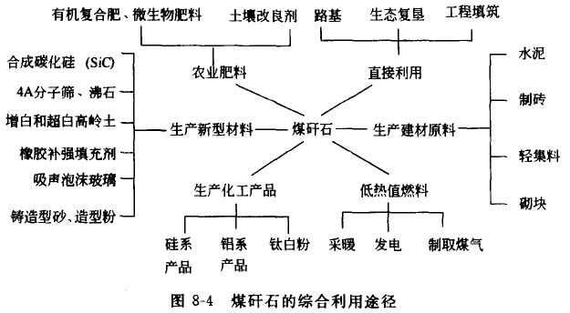 各地的經(jīng)驗(yàn)表明,煤矸石是寶貴的不可更新資源,它兼有煤、巖石、化工原料及元素資源庫等特性。作為煤它可用作研石電廠和礦山沸騰爐的燃料,利用其余熱,制成型煤還適合層燃爐使用;作為巖石,它在理材領(lǐng)域用途廣泛,如生產(chǎn)水泥、制磚瓦、鋪路,既可以替代黏土和石料,又能節(jié)約能源;作為化工原料,由于煤酐石中硅、鋁等元宏的含量商,可以制備硅系化學(xué)品、鋁系化學(xué)品,如硅酸鈉、硫釀鋁、聚合氯化鋁等,并可用來生產(chǎn)某些新型材料,如Sic、分子篩等;而由于煤酐石臺(tái)有硫、鐵、鋇、鈣、鈷、鎵、釩、鍺、鉭、鈾等50多種微量元素和稀有元隸,當(dāng)某種元素或某幾種元素富集到具有工業(yè)利用價(jià)值時(shí),還可對其加以回收利用。煤殲石的綜合利用途徑如圖8-4所示。