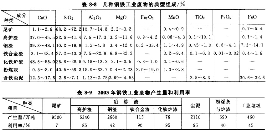 隨著鋼鐵工業(yè)的蓬勃發(fā)展,近幾年我國鋼鐵產量已穩(wěn)居世界首位,2003年我國鋼產量已達到2.2億噸,接近世界總產量的20%;但同時也排放了約1.7億噸的廢物,包括開采廢石、選礦尾礦、高爐渣、鋼渣、鐵合金渣、含鐵塵泥、粉煤灰等,其典型組成如表8-8所示。