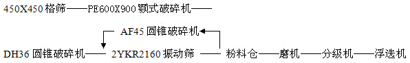 現(xiàn)針對云南銅礦的技術(shù)改造升級及圓錐破碎機在銅礦中的應用進行一個分析比較。原來工藝流程為:450X450格篩——PE600X900顎式破碎機——DH36圓錐破碎機——粉料倉——磨機——分級機——浮選機,由于原來DH36圓錐破碎機為中碎圓錐機,在此處作為最終碎礦作業(yè),碎礦成品粒度在40mm以下,以此成品做為磨機的粉礦原料,從磨礦追求的“多破少磨”的碎礦理念來講,明顯是很不明智的,使得整個選礦能耗大大增加。原來設(shè)計流程,一次投入較小,短期內(nèi)見效快。但對于長期運行,磨機耗電量和球磨介質(zhì)鋼球磨損來看,進入磨機的礦石從小于40mm,磨到85%-200目以下,明顯運行成本太高。對于當今礦石品位越來越低來講,企業(yè)會感覺成本太高,所以技術(shù)升級改造也是迫在眉睫。