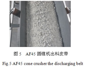 經(jīng)現(xiàn)場積滿給料如圖4,出料如圖5,經(jīng)過測試,AF45圓錐破碎機排料口設(shè)定在25mm時,通過能力為295噸/小時,出料中12mm以下占52%,這樣算來12mm以下153.4噸/小時,大于樣本中13mm以下105噸/小時,所以AF45圓錐從產(chǎn)能和生產(chǎn)指標完全達到并超過設(shè)計參數(shù)。