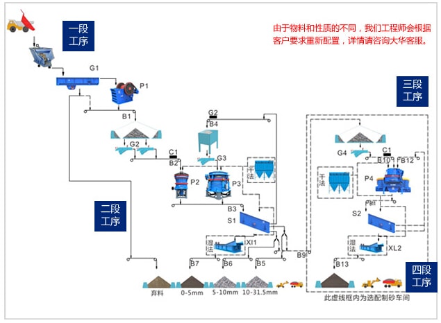 花崗巖大塊物料經(jīng)料倉由振動給料機(jī)均勻喂料,輸送到顎式破碎機(jī)進(jìn)行粗碎,粗碎后的物料經(jīng)振動篩篩分后,由皮帶輸送機(jī)輸送至反擊式破碎機(jī)或圓錐破碎機(jī)進(jìn)行中細(xì)碎。