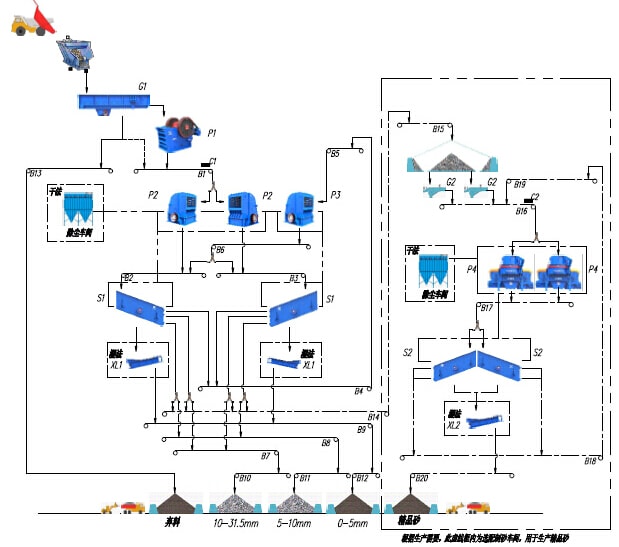 該生產(chǎn)線生產(chǎn)工藝適用于產(chǎn)量600t/h噸石灰石(白云巖)類(lèi)中等以下硬度物料的加工破碎,將經(jīng)過(guò)爆破處理或開(kāi)挖洞采的毛料通過(guò)棒條給料機(jī)均勻的供給顎式破碎機(jī)破碎,經(jīng)顎式破碎機(jī)破碎后的半成品物料通過(guò)皮帶機(jī)輸送給反擊式破碎機(jī)進(jìn)行二次破碎,經(jīng)反擊破二次破碎后的混合骨料經(jīng)過(guò)皮帶機(jī)輸送至一篩車(chē)間進(jìn)行分級(jí)篩分,篩分過(guò)后將大于用戶需要的大顆粒物料通過(guò)皮帶機(jī)輸送至細(xì)碎反擊式破碎機(jī)再進(jìn)行破碎,破碎后的物料再通過(guò)皮帶機(jī)也輸送至一篩車(chē)間進(jìn)行篩分,篩分過(guò)后的不同顆粒級(jí)別的成品通過(guò)成品出料皮帶機(jī)輸送至成品料倉(cāng)。不符合要求的大顆粒再次返回細(xì)碎反擊式破碎機(jī)進(jìn)行循環(huán)破碎。如果成品砂需要水洗也可以配置洗砂機(jī)用于成品砂的水洗,該系統(tǒng)的棒條給料機(jī)還具有預(yù)篩分功能,可以將原料中的細(xì)顆粒物料提前分離直接進(jìn)入后續(xù)的破碎設(shè)備,也可將原料中的泥土雜物作為棄料預(yù)先分離。