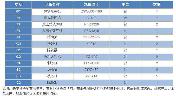 600t/h---石灰石(白云巖)類(lèi)巖石的砂石骨料生產(chǎn)工藝設(shè)備配置表