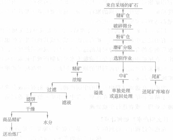 來自采場的礦石要經(jīng)過選礦過程的各個(gè)作業(yè),最后才能得到符合冶煉要求的精礦,如圖所示。