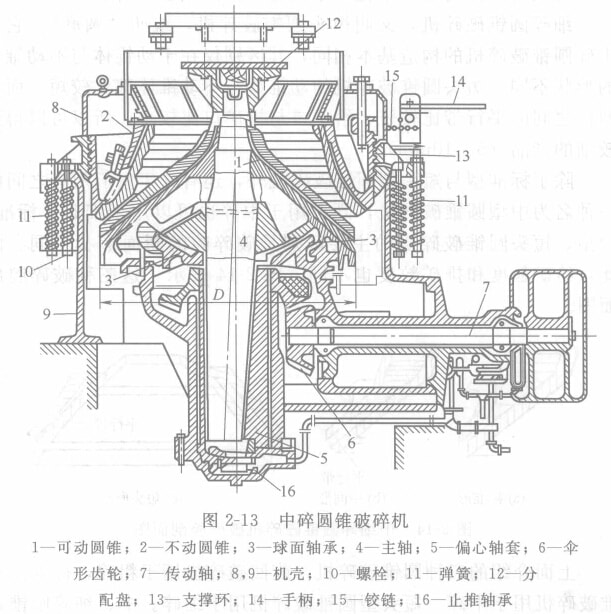 礦石由給礦口通過分配盤12落入機中,分配盤裝在堅軸上端,由于豎軸的旋轉而獲得振動,把礦石均勻地分配在銷體叫周。借助于附有手柄14的鉸桿及鉸鏈15,使小動錐體上升或下降,以調節(jié)排料口的寬度。各部件均用鑄鋼制造,動錐體與不動錐體的工作面鑲以錳鋼襯板,以保護圓錐不受磨損,襯板磨損后可以更換,更換時,襯板與錐面間灌入熔化的鉛使它們之間緊密粘合。