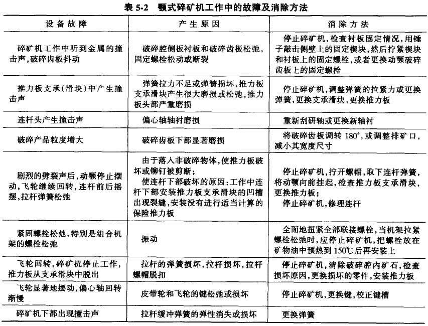 顎式碎礦機(jī)在使用操作中,必須注意經(jīng)常維護(hù)和檢修。在碎礦車(chē)間中,顎式碎礦機(jī)的工作條件是非常惡劣的,設(shè)備的磨損問(wèn)題是不可避免的。但是,機(jī)器零件的過(guò)快磨損,甚至斷裂,往往都是由于操作不正確和維護(hù)不周到造成的。所以,正確的操作和精心的維護(hù)(定期檢修)是延長(zhǎng)機(jī)器的使用壽命和提高設(shè)備的運(yùn)轉(zhuǎn)串的重要途徑。在日常維護(hù)工作中,操作人員要能正確地判斷設(shè)備故障,推確地分折原因,從而迅速地采取消除方法。領(lǐng)式碎礦機(jī)常見(jiàn)的設(shè)備故障、產(chǎn)生原因和消除方法見(jiàn)表5-2。