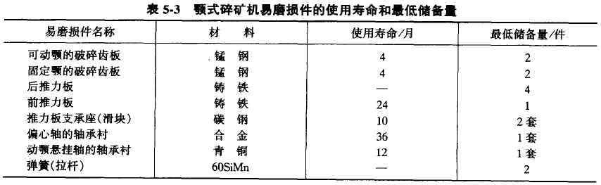 在一定條件下工作的設(shè)備零件,其磨損情況通常是有一定規(guī)律的,工作了一定時(shí)間以后,就需要進(jìn)行修復(fù)或更換,這段時(shí)間間隔叫做零件的磨損周期(或稱(chēng)為零件的使用期限)。顎式碎礦機(jī)主要易磨損件的使用壽命和最低儲(chǔ)備量的大致情況可參見(jiàn)表5-3。