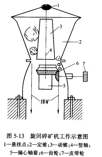 圓錐碎礦機雖因其用途和結(jié)構(gòu)上的不同,有粗碎和中、細碎之分,但其工作原理基本上是相同的,F(xiàn)以粗碎用的圓錐碎礦機為例說明其工作原理。如圖5-13所示,動錐2在定錐1內(nèi),其中空間為破碎腔。物料從上部給人,由于偏心軸套4的作用,使動錐作旋擺運動,周期地靠近與離開定錐,當(dāng)動錐靠近定錐一邊時,產(chǎn)生破碎礦石的作用。離開的一邊,已破碎的礦石從破碎腔排出。圓錐碎礦機的工作原理與顎式碎礦機相似,可以看成是連續(xù)工作的顎式破碎機,這類破碎機對礦石的作用力,除有壓碎作用外,還有彎曲及磨剝作用,且系連續(xù)工作,故生產(chǎn)能力也高得多。