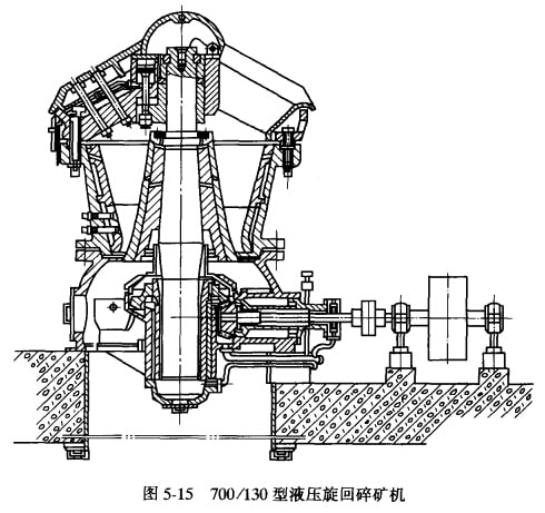 圖5-14是我國自制的PX900/150型中心排礦的旋回碎礦機。