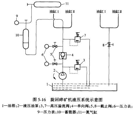 當碎礦機的破碎腔落入非破碎物時,油缸內壓力增高,當超過正常值時,就迫使油流至蓄能器中,動錐下降,徘礦口增大,排出非破碎物。這時油缸中的壓力降低,油又在蓄能器的壓力作用下返回袖缸升起動錐,使排礦口恢復到原來位置,碎礦機仍繼續(xù)工作。