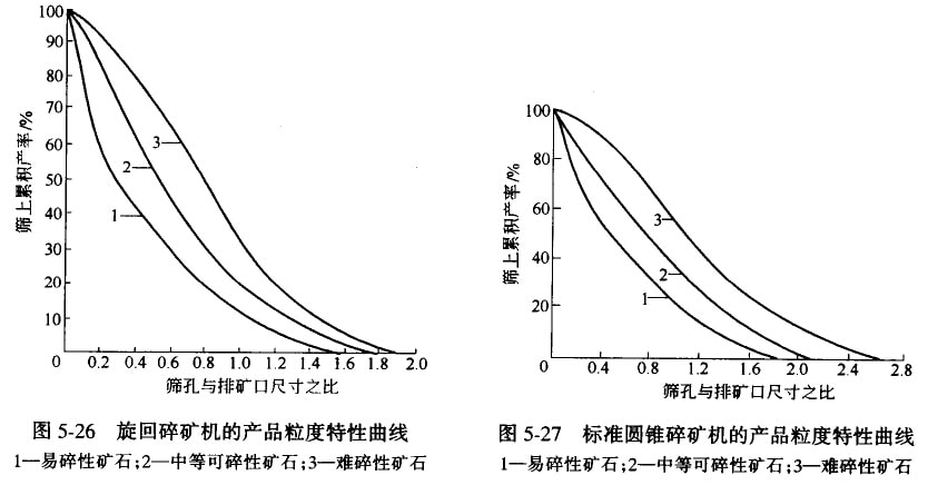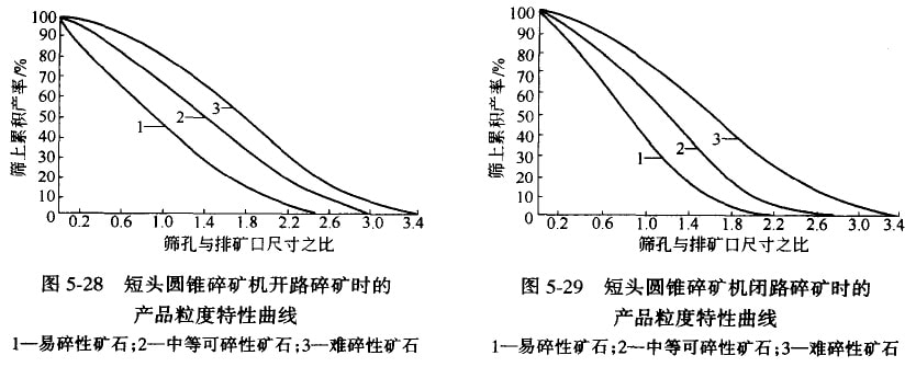 旋回碎礦機(jī)和標(biāo)準(zhǔn)型圓錐碎礦機(jī)的產(chǎn)品粒度特性曲線(xiàn),分別如圖5-26及圖5-27所示,短頭型圓錐碎礦機(jī)在開(kāi)路和閉路碎礦時(shí)的產(chǎn)品粒度特性曲線(xiàn),分別如圖5-28及圖5-29所示。所有碎礦機(jī)的產(chǎn)品粒度特性曲線(xiàn)的意義和用途都相同,在前面已作過(guò)介紹,在此不重述。