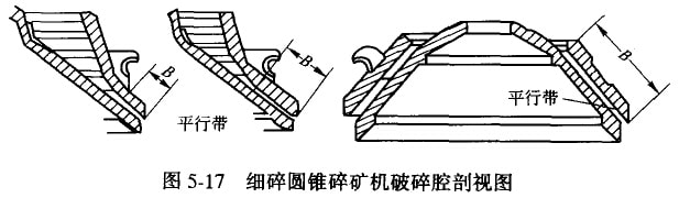 中、細(xì)碎圓錐碎礦機(jī)按其破碎腔形狀不同可分為標(biāo)準(zhǔn)型、中間型及短頭型三種。它們的構(gòu)造和工作原理完全相同,只是破碎膠的形狀不同,即平行帶的長(zhǎng)度不同。如圖5-17所示。以標(biāo)準(zhǔn)型的平行帶最短,短頭型的平行帶最長(zhǎng),而中間型的平行帶長(zhǎng)度介于二者之間。